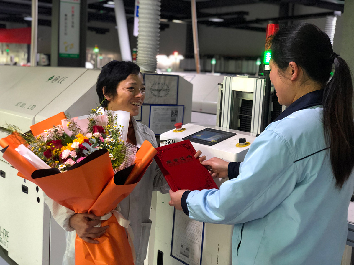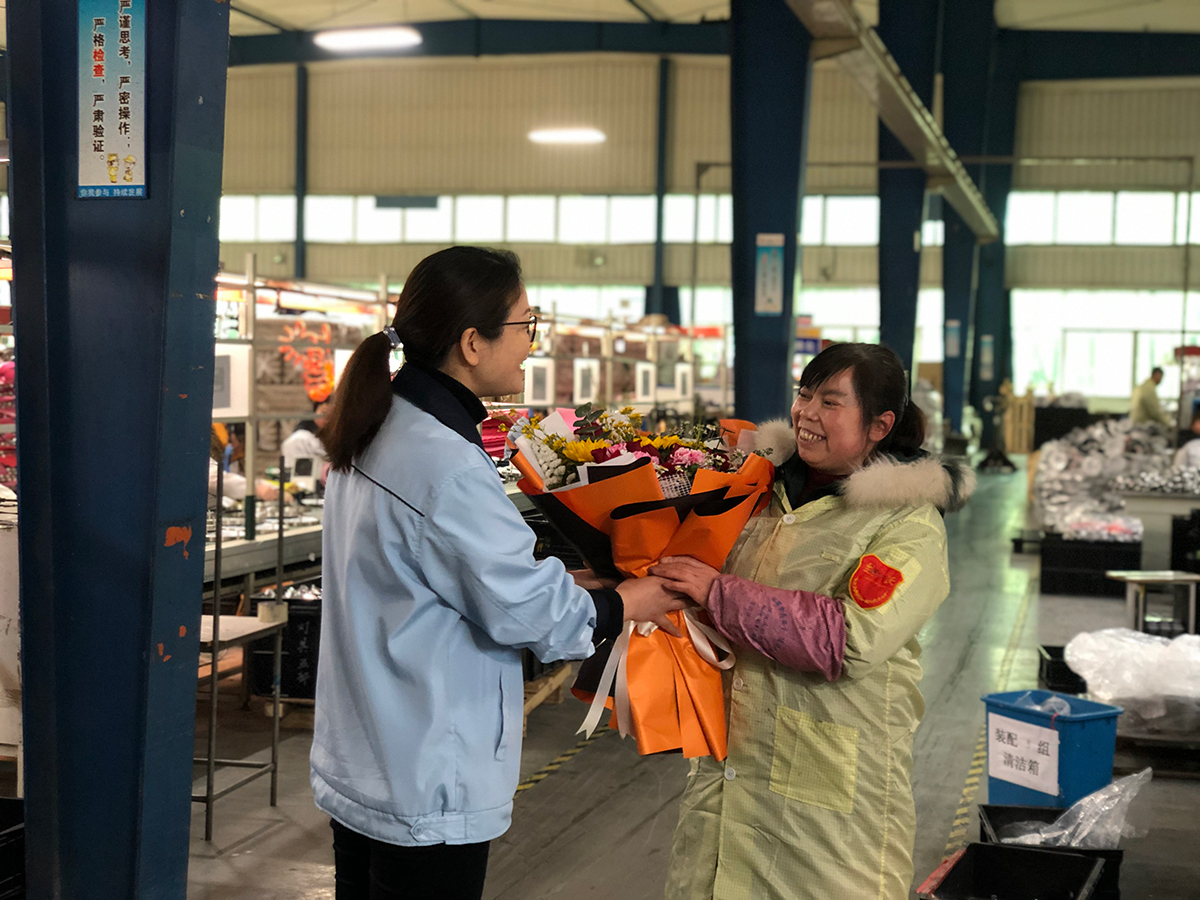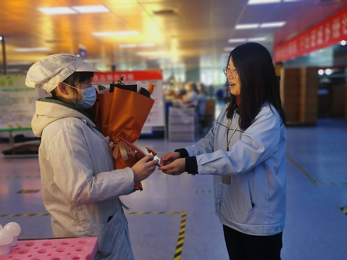3月6日上午,公司妇联执委一行几人来到生产一线,为2021年度“三八红旗手”送去节日祝福,集团4个生产基地共20名最美女工均来自生产一线。