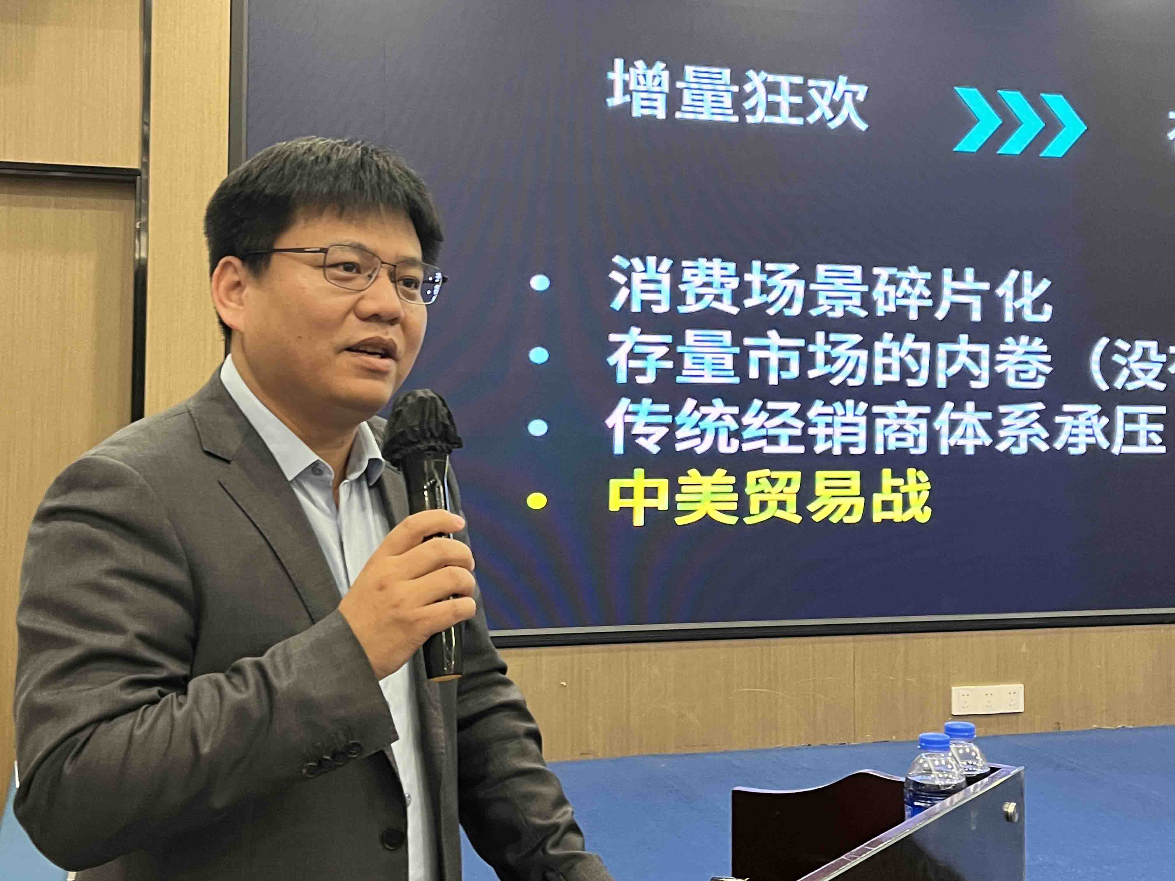 刘方洲上台做了《探索经销商突围之道》的主题分享。他表示,经销商要学会接受消费降级、品牌竞争剧烈、利润下滑、增量变存量的市场现状。